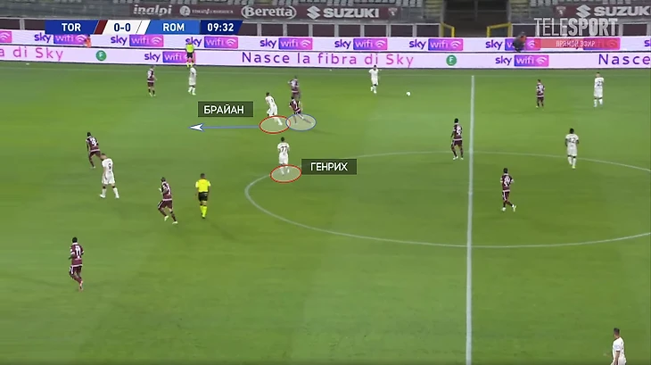 В матче с Вероной Кристанте часто играл персонально по 10 номеру, часто выходил из линии за опекаемым и навязывал борьбу. Помимо того, такая кадровая рокировка положительно сказалась на контроле и переходе в атаке от Ромы. Брайан часто начинал атаки как вертикальными пересдачами низом, так и верхом, разрезая или отрешая агрессивный прессинг-блок от Вероны (6ая команда по прессинг метрике в Серии А, использует схожие принципы персонально ориентированной игры с Аталантой)