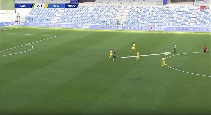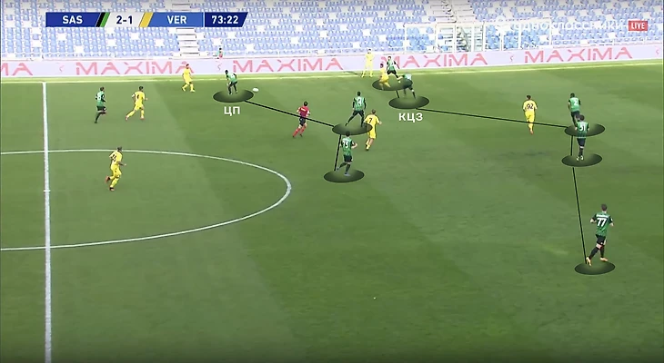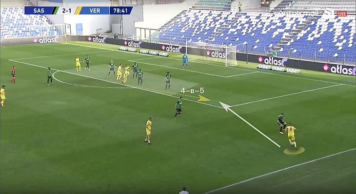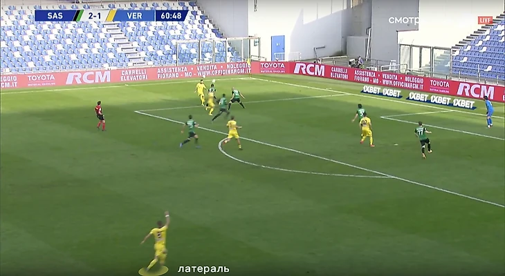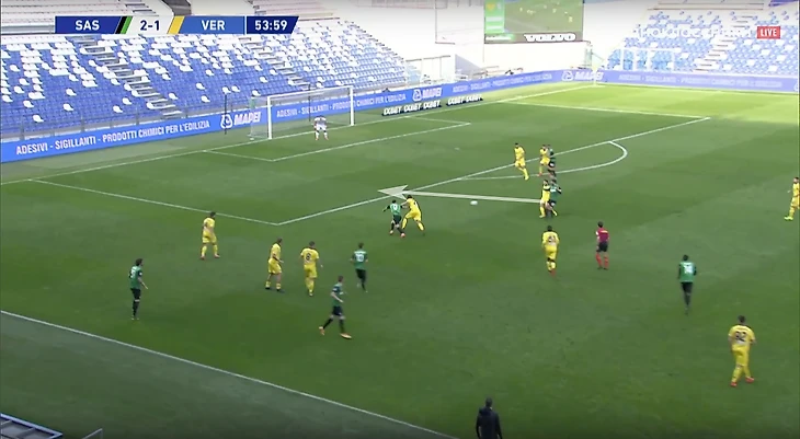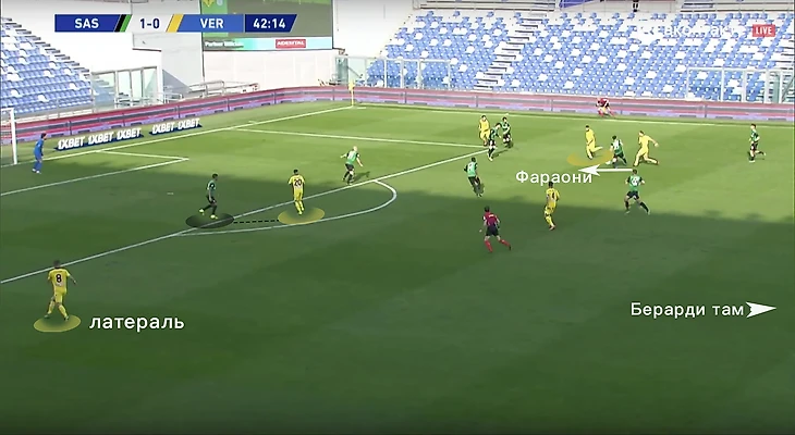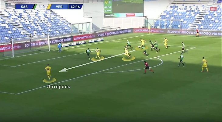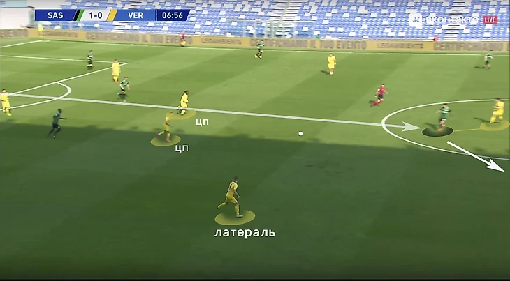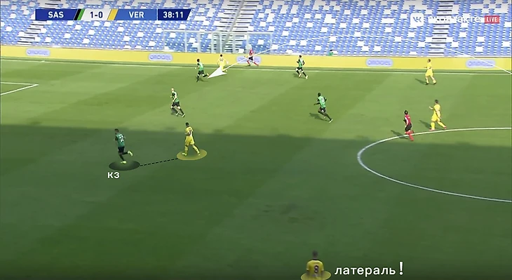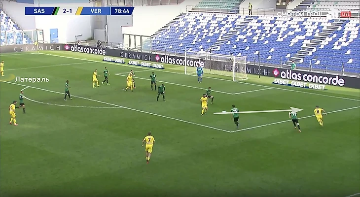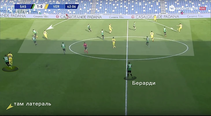 Ни для кого не секрет, что слабое место (как минимум одно из) черно-зеленых – это игра в обороне. Де Дзерби потихоньку улучшает игру в этом компоненте, но проблемы остаются. На примере этой игры: блок работал практически идеально 43 минуты первого тайма, но один провал сразу же оголил другой, и все посыпалось. Для описания плана главного тренера нероверди в среднем блоке стоит немного поговорить про атакующие идеи Юрича. «Верона» схожа с «Аталантой» не только своей игрой в обороне, но и некоторыми механизмами в атаке. Желто-синие также делают упор на фланговую игру. Правда, веронцы отличаются от бергамасков двумя существенными аспектами. Первый – их игра куда более вертикальная. И при создании ромба на фланге часто следует заброс верхом от одной вершины ромба к другой, от центрального защитника к атакующему полузащитнику, либо на форварда. Второй аспект – это зацикленность на одном из флангов. «Верона» редко разворачивает атаку на противоположную сторону по ходу атаки, так как делает упор на навесы, а не на прохождение в штрафную через короткий пас и растягивание оппонента по горизонтали, как «Аталанта», чью структуру мы подробно рассматривали в одном из последних материалов. Веронцы стараются организовать численное большинство на конкретном фланге, после чего идет подача в плотно заполненную штрафную, где латераль с другого фланга включается только в фазе завершения. Понимания эту слабость в циркуляции мяча, «Сасуоло» планировал запереть гостей на одном из флангов подальше от своих ворот – в средней трети поля.