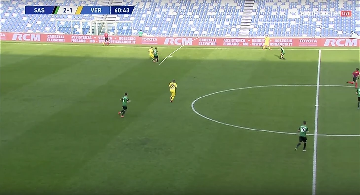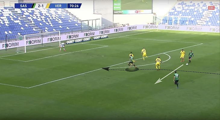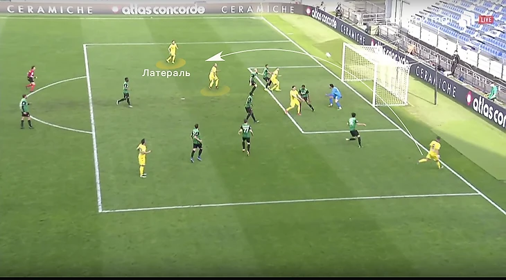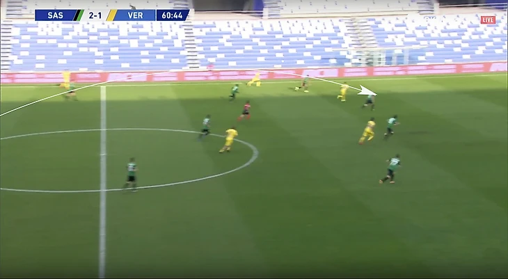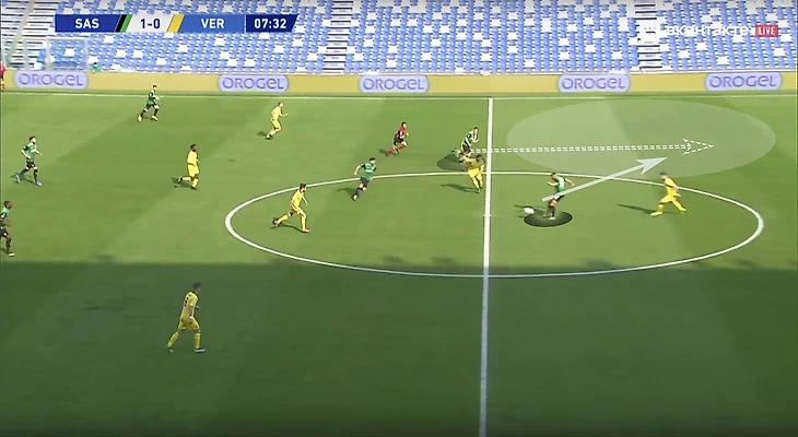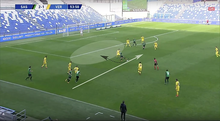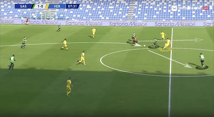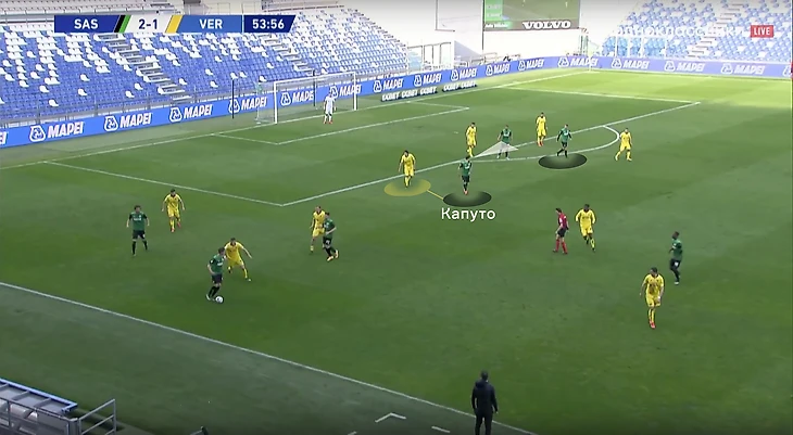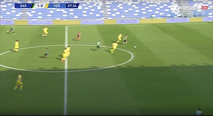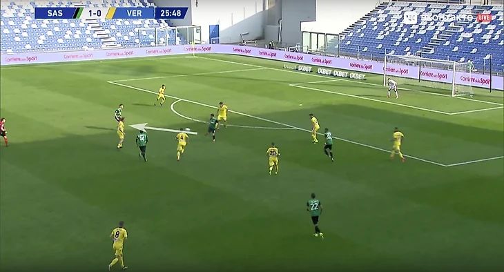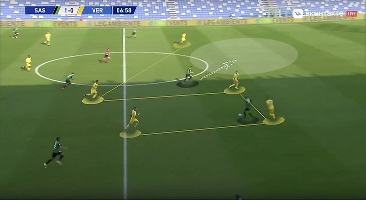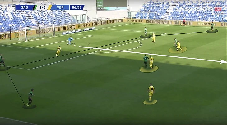 Ни для кого не секрет, что слабое место (как минимум одно из) черно-зеленых – это игра в обороне. Де Дзерби потихоньку улучшает игру в этом компоненте, но проблемы остаются. На примере этой игры: блок работал практически идеально 43 минуты первого тайма, но один провал сразу же оголил другой, и все посыпалось. Для описания плана главного тренера нероверди в среднем блоке стоит немного поговорить про атакующие идеи Юрича. «Верона» схожа с «Аталантой» не только своей игрой в обороне, но и некоторыми механизмами в атаке. Желто-синие также делают упор на фланговую игру. Правда, веронцы отличаются от бергамасков двумя существенными аспектами. Первый – их игра куда более вертикальная. И при создании ромба на фланге часто следует заброс верхом от одной вершины ромба к другой, от центрального защитника к атакующему полузащитнику, либо на форварда. Второй аспект – это зацикленность на одном из флангов. «Верона» редко разворачивает атаку на противоположную сторону по ходу атаки, так как делает упор на навесы, а не на прохождение в штрафную через короткий пас и растягивание оппонента по горизонтали, как «Аталанта», чью структуру мы подробно рассматривали в одном из последних материалов. Веронцы стараются организовать численное большинство на конкретном фланге, после чего идет подача в плотно заполненную штрафную, где латераль с другого фланга включается только в фазе завершения. Понимания эту слабость в циркуляции мяча, «Сасуоло» планировал запереть гостей на одном из флангов подальше от своих ворот – в средней трети поля.