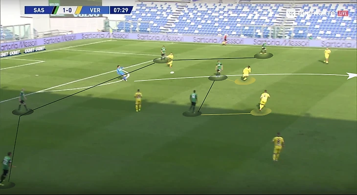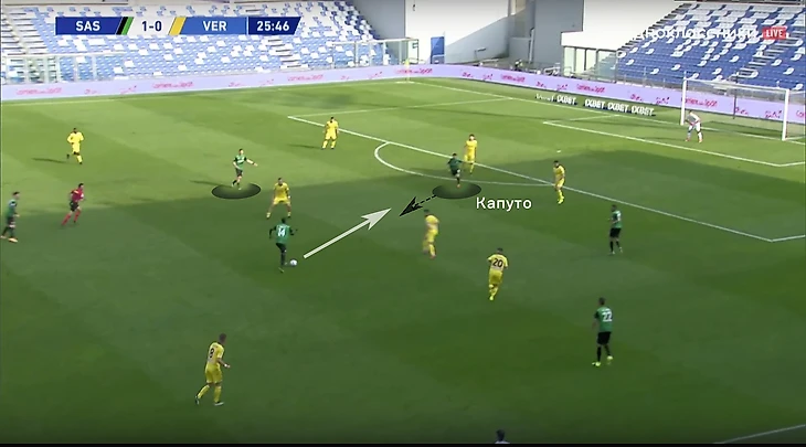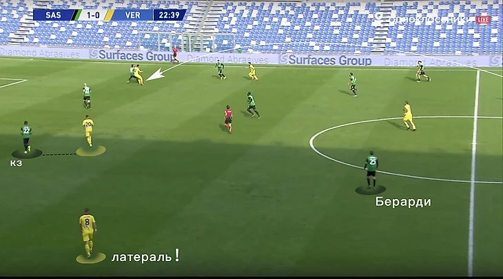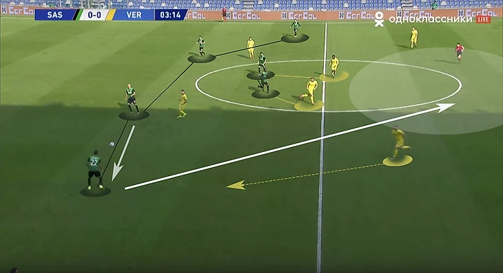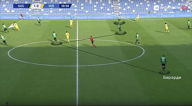 Матч начался по прогнозируемому сценарию – хозяева контролировали мяч внизу, а гости выдавливали это владение подальше от своих ворот, используя персональные ориентировки. У главного тренера нероверди было несколько идей по взлому такого давления и дальнейшей доставки мяча в финальную треть. Во-первых, билдап в структуре 4-2 (2-4). У Де Дзерби есть множество вариантов построений при начале атаки, этот входит в число самых популярных и применяется, когда соперник высоко встречает короткие розыгрыши «Сассуоло». Такие розыгрыше позволяли создавать численное преимущество против верхней пятерки «Вероны». Кто-то из крайних защитников хозяев получал свободу благодаря своему низкому расположению – латерали гостей не рисковали так высоко подниматься в давление и встречали оппонента с опозданием после приема мяча.