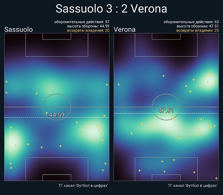 План Де Дзерби точно можно назвать интересным, он пытался максимально замаскировать высокие позиции вингеров своей команды, но при малейшем провале команда оставалась без подстраховки, и все ее слабости вскрывались. Во втором тайме у хозяев начала накапливаться усталость, в связи с этим появлялись разрывы между линиями, да и защита «Сассуоло» уже не всегда успевала за рывками нападающих «Вероны» под заброс: