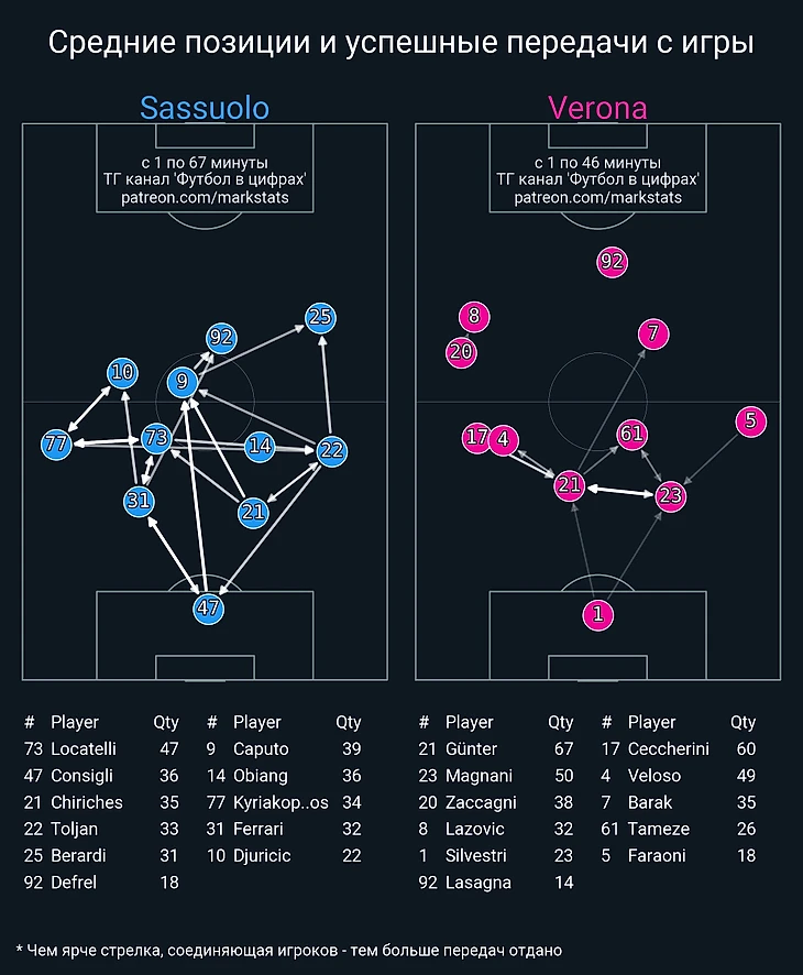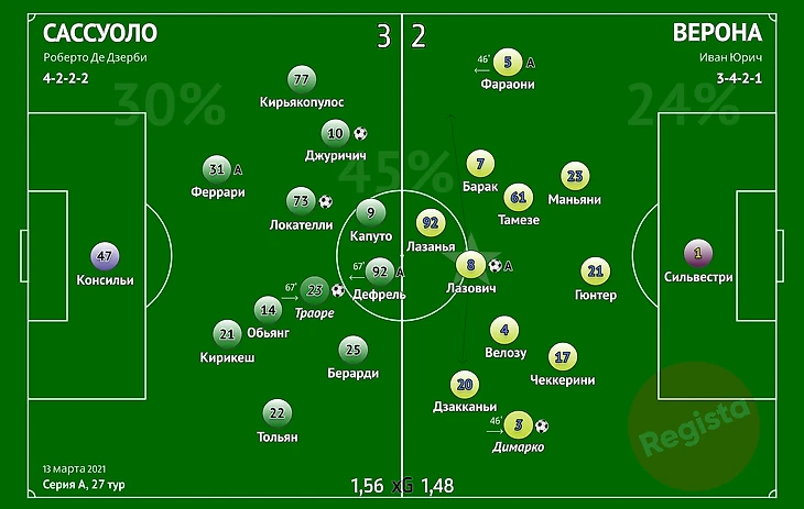 Матчи против соперников, которые делают упор на высокое давление (особенно, если это давление персональное), служат лучшей проверкой для команд, ставящих во главу угла владение. Для команд, которые стараются выходить низом со своей трети, имеют четкую позиционную структуру, совершают большое число подготовительных передач. «Сассуоло» как раз является одним из самых ярких приверженцев позиционной игры в Серии А, а «Верона» любит высоко встречать соперника, к тому же делает это с персональными ориентировками. Прошлая подобная проверка для Де Дзерби прошла не лучшим образом. В январе было крупное поражение от «Аталанты» и, хоть в том матче бОльшие проблемы возникли в стадии обороны, трудности со владением и ошибки на своей половине поля присутствовали. Посмотрим, смог ли Роберто Де Дзерби улучшить игру своей команды за этот небольшой временной промежуток, и что предложил Иван Юрич в противовес. Стартовые составы Состав «Вероны» был таким же, как неделей ранее в матче против «Милана» (0:2). Никаких сюрпризов Юрич не подготовил. У «Сассуоло» изменения были, причем достаточно существенные. Как минимум сменилась схема: в прошлом туре Де Дзерби решил поэкспериментировать и выбрал схему с тройкой центральных защитников, что для черно-зеленых не свойственно. В этом матче вернулась схема 4-2-3-1 (4-4-2), и вместе с ней – основной центральный защитник Влад Кирикеш.