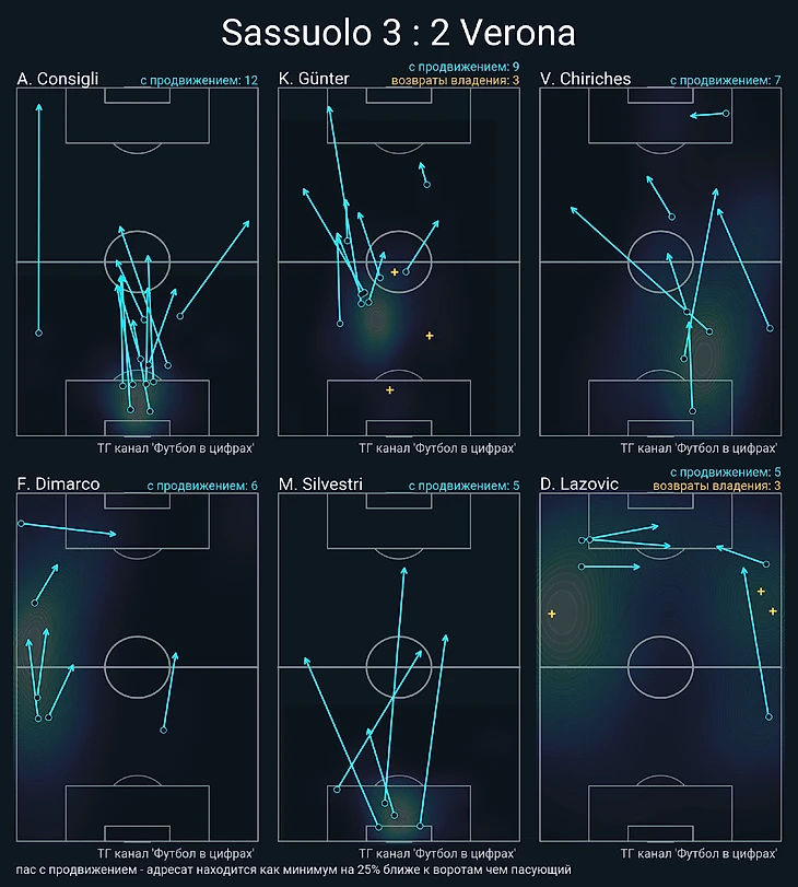 Уверенная игра ногами вратаря «Сассуоло» позволяла применять такой прием, минимизируя риски потери. Лидерство вратарей по передачам с продвижением в матчах против прессингующих команд для нас уже не новость.Графика: "Футбол в цифрах":