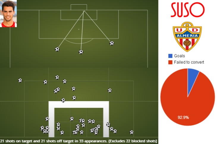 Сусо забил за "Альмерию" 3 мяча (два из которых вы могли видеть), причем все – дальними ударами. Но вообще испанец не лучший реализатор моментов – на эти 3 мяча у него ушло 64 удара, причем 21 удар был мимо ворот, а 22 – и вовсе заблокированы.