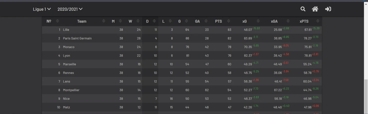 Что же касается "ПСЖ" то по ожидаемым очкам он был второй после "Лиона". хPTS - 78.27, а у Лиля этот коэффициент был равен хPTS - 67.61. Вообще относительно статистики в этой паре было не всё так очевидно и конечно всё решилось исполнителями на поле. "Лиль" перебрал согласно хPTS 15 очков, закончив чемпионат с 83 очками (на 1 очко опередив "ПСЖ" с 82). По xG, "Лиль" перебрал 16 голов (xG - 48.07, забитые голы - 64).