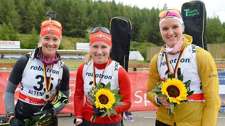 Среди девушек поначалу лидировала Янина Хеттих: самая молодая участница немецкой команды 1А заняла верхнюю строчку. 24-летняя Хеттих с единственным промахом на последней стрельбе стоя пересекла линию финиша чемпионкой Германии, преодолев дистанцию за 37:42.1. Марен Хаммершмидт продолжила свое возвращение в элиту, финишировав второй с отставанием на 14,4 секунды и также с одним промахом. Третье место досталось Дениз Херрман с отставанием на 1:03.1 и пятью 45-секундными штрафами. Херрман, как всегда, уверенно доминировала на трассе, справившись со сложной трассой Альтенберга на 1:56 быстрее, чем победительница Хеттих.