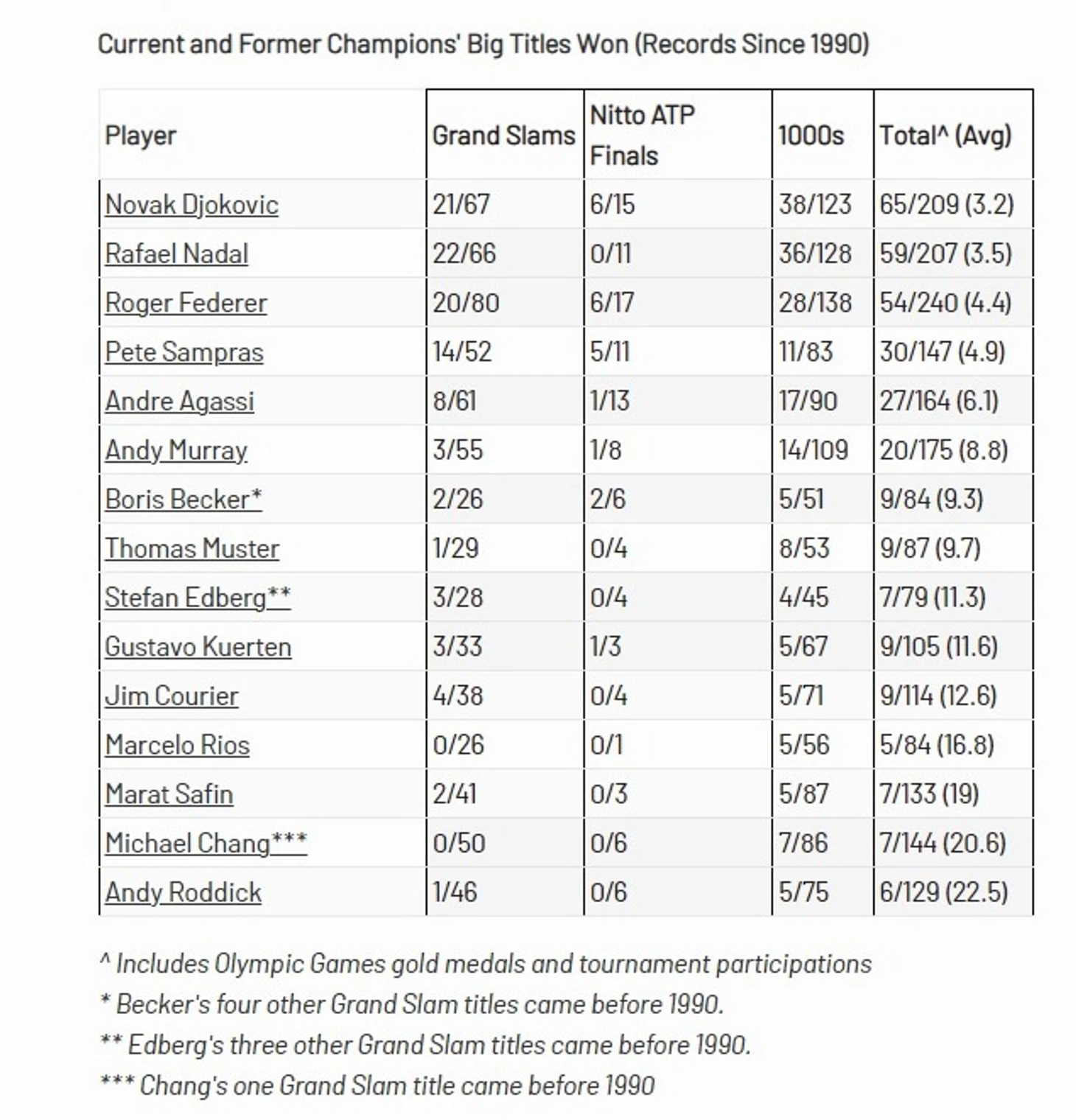 Показатель завоевания Джоковичем "Больших титулов" держится на уровне один трофей на каждые 3,2 сыгранных турнира (65/209), в то время как Надаль завоевывал один "Большой титул" на каждые 3,5 сыгранных им турниров (59/207). Единственными другими игроками, которые завоевывали "Большой титул" чаще, чем один раз за пять сыгранных турниров, являются Федерер (4,4, 54/240) и Пит Сампрас (4,9, 30/147).