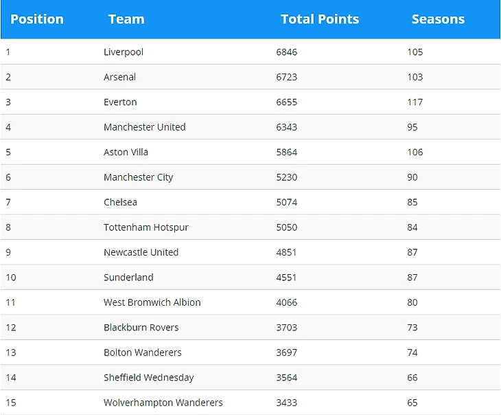 Таблица чемпионата Англии всех времен. «Ливерпуль» – первый, «Арсенал» и «Эвертон» – в тройке