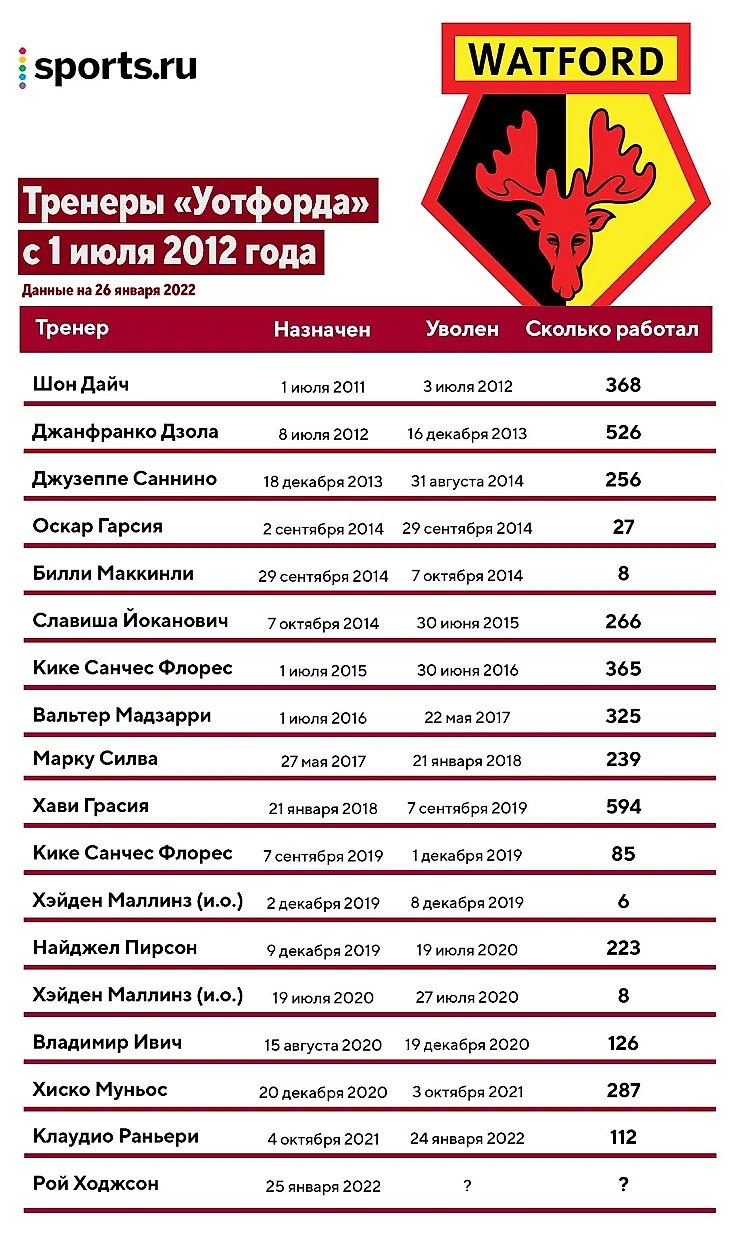 Новый тренер принял «Уотфорд» до конца сезона, а с дальнейшими планами стороны определятся летом. Однако до июня еще нужно продержаться. В «Уотфорде» самое нетерпеливое руководство – например, в сезоне-2019/20 «Уотфорд» стал первым клубом АПЛ с 3 уволенными тренерами за чемпионат:
