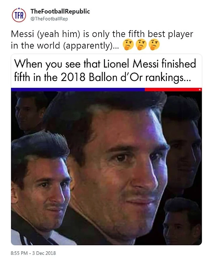 Многие болельщики тоже были удивлены. Фраза «Всего лишь пятый игрок мира» стала мемом, который использовали после каждого крутого гола или ассиста Лео в тот год.