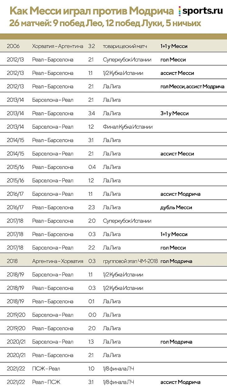 Модрич знает о чем говорит, так как часто играл против Месси в Испании. За 26 матчей во всех турнирах перевес пока в пользу хорвата: 12 побед, 5 ничьих и 9 поражений. Хорватия победила в обеих играх против Аргентины, в которых принимал участие Лука.