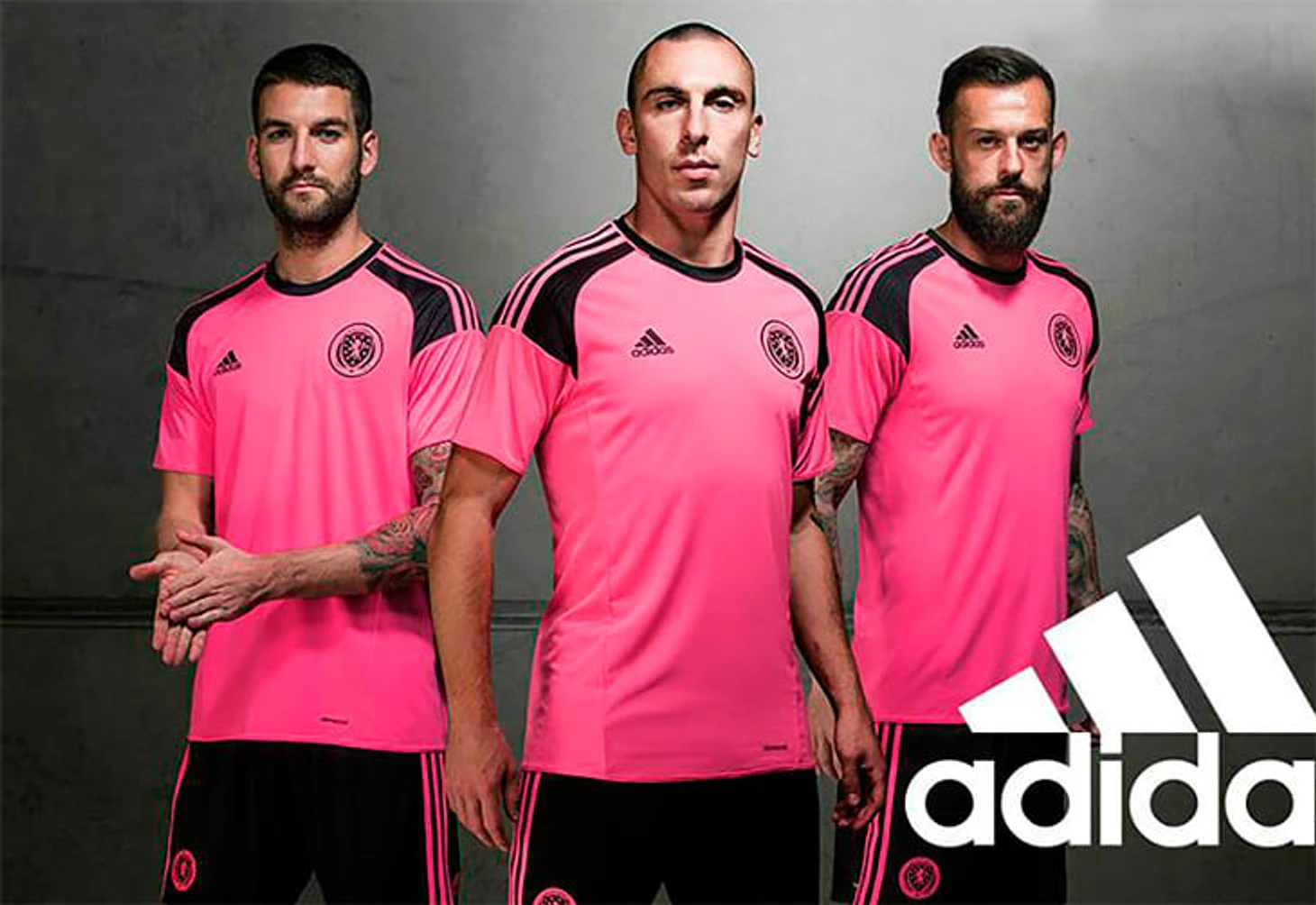 Федерация футбола Шотландии осталась в восторге от реакции на полосатую форму и решила пойти еще дальше. В январе 2016-го adidas презентовал ярко-розовые выездные футболки с черными вставками на плечах.