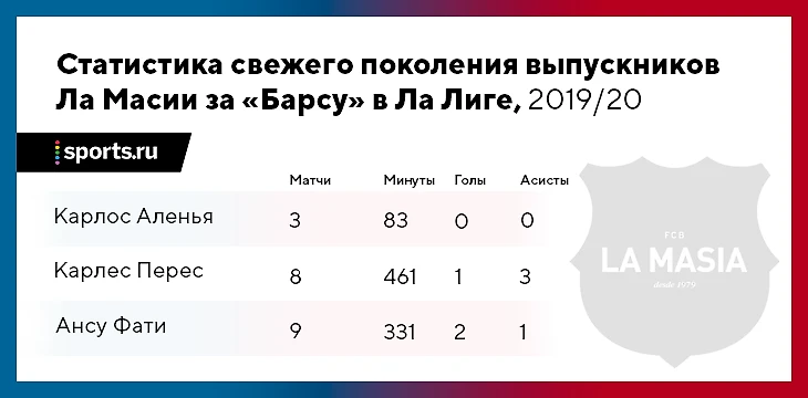 В 2018-м «Барса» вышла на матч с «Сельтой» с нулем воспитанников в составе. Это случилось из-за травм Месси и Бускетса, но даже с ними в течение сезона в основе появлялись только шесть воспитанников (Лео, Бускетс, Иньеста, Пике, Альба и Роберто). В последний раз так мало было в 2002 году (тогда играли четверо выпускников Ла Масии: Хави, Пуйоль, защитник Фернандо Наварро и полузащитник Роберто Трасоррас). На зиму 2019-го последний воспитанник, закрепившийся в основе «Барсы» – 28-летний Серджи Роберто.