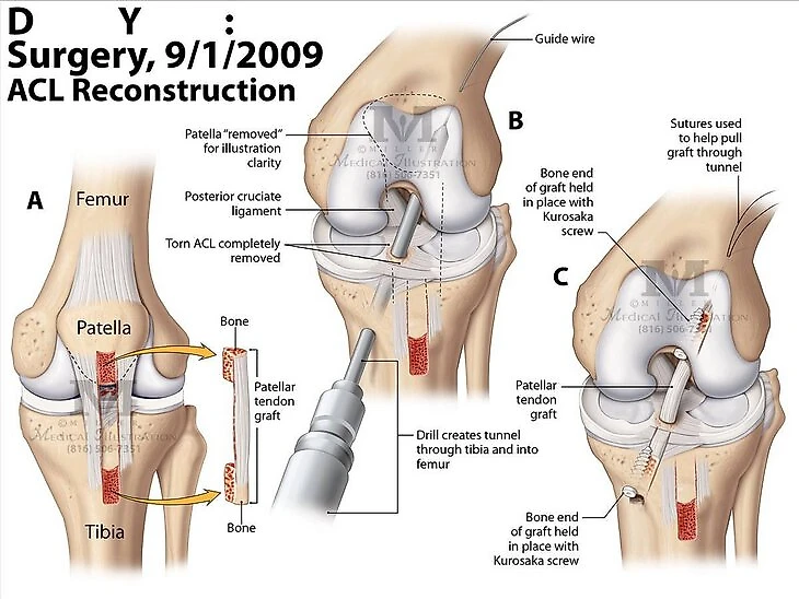Чтобы установить трансплантат связки, хирурги сверлят костные тоннели в бедренной и большеберцовой кости. Но есть нюанс – трансплантат надо где-то взять. Существует несколько техник, но, как правило, берут сухожилие одной из мышц бедра.