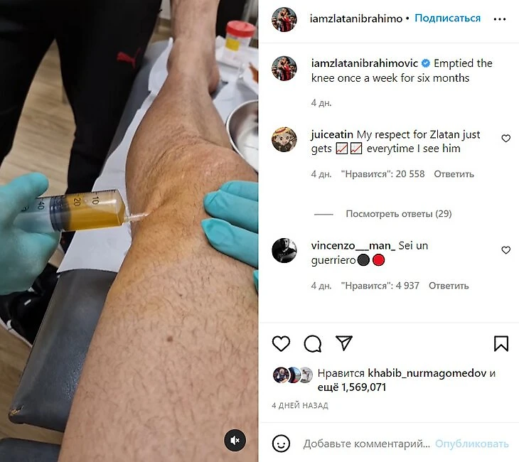 Чуть позже Златан выложил видео, на котором ему откачивают жидкость из коленного сустава. Выглядит жутко, Ибра утверждает, что проходил через эту процедуру раз в неделю.