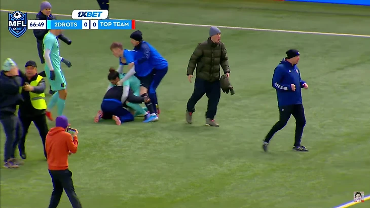 А дальше игроки 2Drots и Top Team начали толкать друг друга. Казалось, что на этом закончится, но вмешался вратарь Top Team: он разбежался и с двух рук влетел в голову стоящего чуть в стороне Крапа.