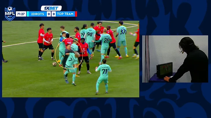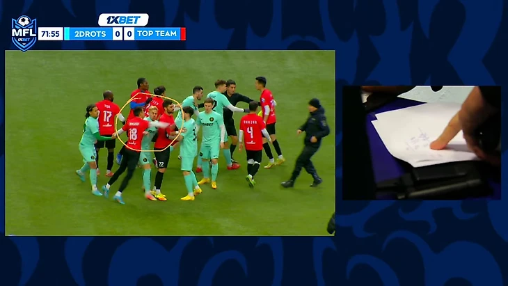 Форвард 2Drots Крап пошел в эффектный дриблинг недалеко от штрафной соперника, но игрок Top Team толкнул его в спину. Крап рухнул на газон, а еще одни игрок Top Team ударил по мячу и попал в лежащего Крапа. Еще один игрок 2Drots – Слон – толкнул этого игрока.
