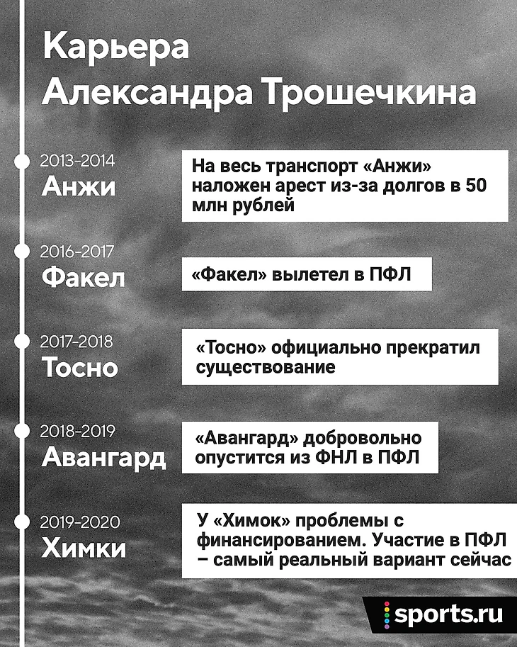 Вот профайл Трошечкина и заголовки новостей Sports.ru о каждом из его клубов: