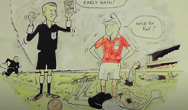 Кенни Ламберт (с небольшими вкраплениями брата Терри): «После игры арбитр по очереди зашел в обе раздевалки и объявил, что все, кто еще не получил предупреждения, его получат прямо сейчас. За агрессивное несогласие с его решениями. Ну да, мы ворчали сквозь зубы. Но агрессивно – пихаться, давать подзатыльники – этого точно не было. Рефери швырнул нам блокнот – мол, перепишите все имена. Так под раздачу попал даже Пол Литтл. Его в начале второго тайма увезли в больницу на скорой – с тяжелым рассечением. То есть, он получил желтую карточку, находясь в паре миль от стадиона, зашивая себе голову».