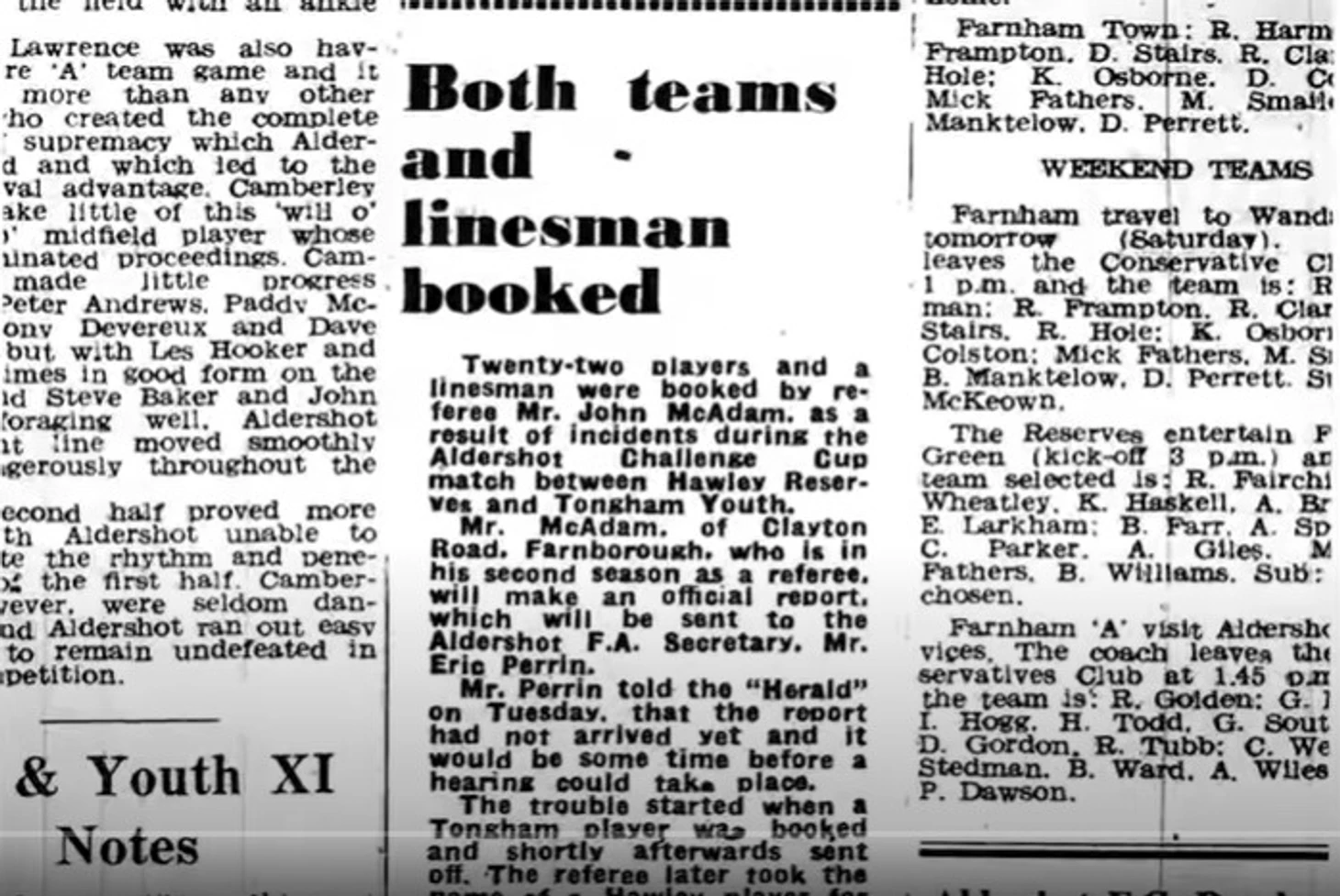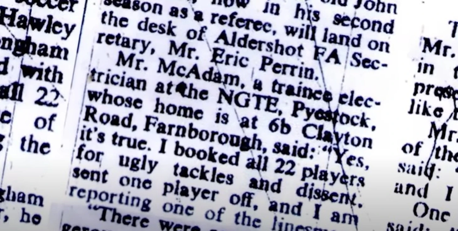 Во-первых, там была фамилия рефери. Мистер Джон Макадам. Во-вторых, по какому-то немыслимому недосмотру редактора (за такие излишние интимные подробности, по-хорошему, нужно ставить на горох), там было опубликовано также место его работы (электрик в NGTE Pyestock) и место жительства (Фарнборо, Клейтон роуд, 6b). Как будто кто-то знал, что спустя 50 лет эта информация может пригодиться.
