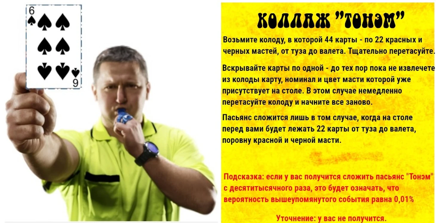 Представим, что все 22 игрока получили свои «горчичники» в обычном порядке – за грубые фолы, симуляции, агрессию и разговорчики в строю. Знаете, какова вероятность того, что желтые равномерно распределятся между всеми участниками матча и при этом ни один из них не будет удален? Я не знаю. Но вы можете мне помочь, разложив пасьянс «Тонэм».