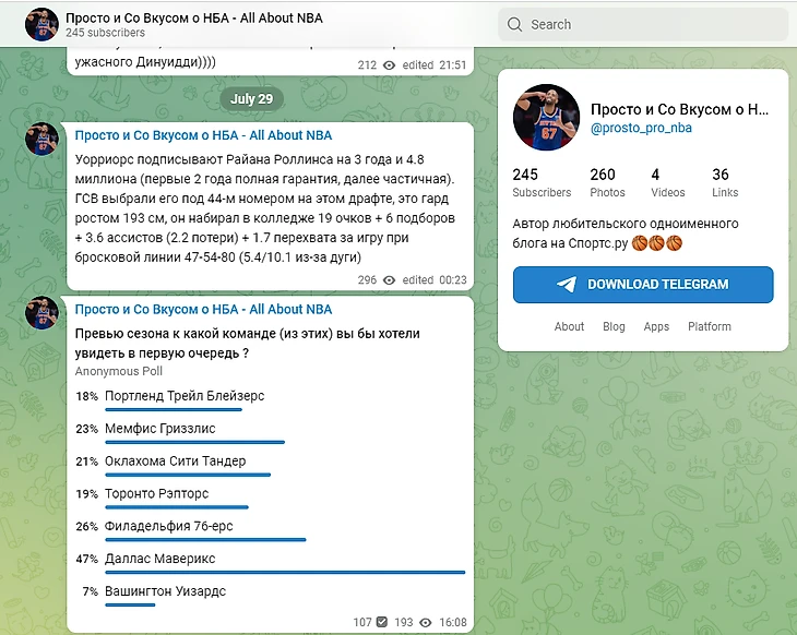 Вот мой телеграм-канал, где и проходят опросы, публикуется много дополнительного контента и все важные новости мира НБА. Прямая ссылка: https://t.me/s/prosto_pro_nba