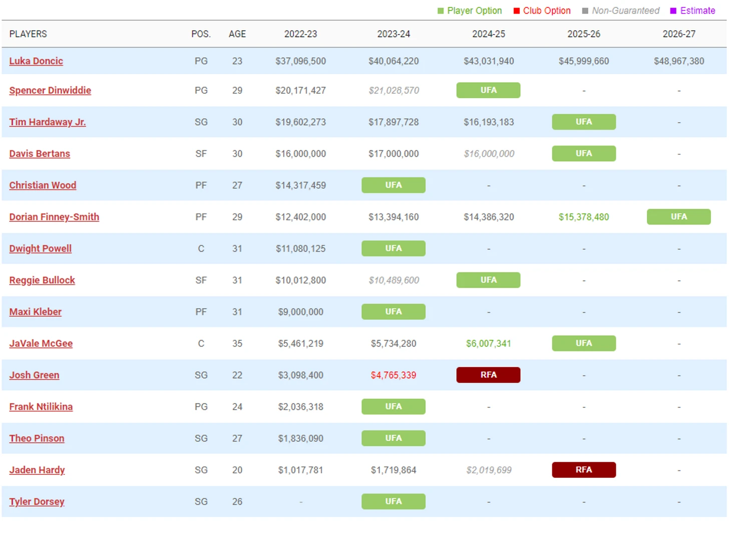В грядущем сезоне в силу вступает максимальный контракт Луки Дончича, который увеличит платежку Далласа до 161.5 миллионов долларов. На фото выше вы уже могли заметить, что игроков можно смело делить на хорошие и не очень контракты. Давайте попробуем прикинуть кто куда относится.