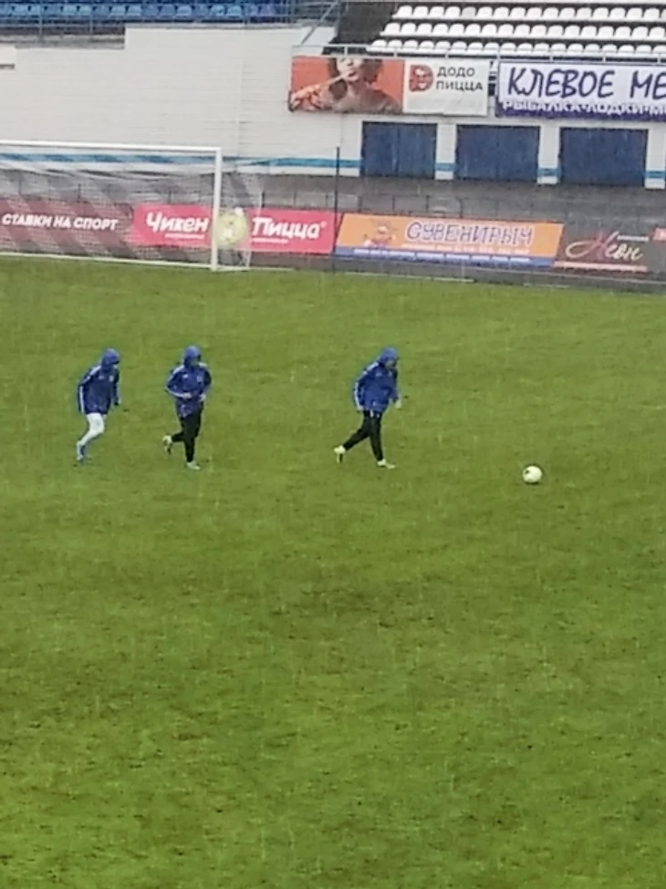 Но и в такая погода не отпугнула запасных футболистов обеих команд, которые самоотверженно вышли на разминку, несмотря на прохудившиеся небеса. А самые сознательные, даже в таких экстремальных условиях, не забывали о необходимости постоянного ношения средств индивидуальной защиты.