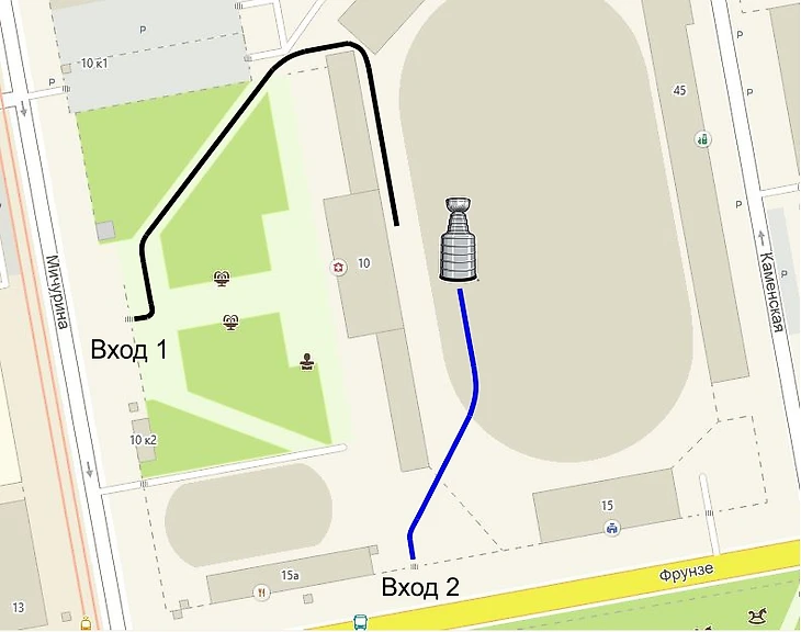Черным на картинке указан путь для зрителей на трибуну с улицы Мичурина. Синим же показана траектория движения участников с улицы Фрунзе. Как можно видеть, потоки не пересекаются, что минимизирует попытки зрителей стать участниками. Для обеспечения безопасности на массовом мероприятии на обоих входах необходимо установить рамки, стюардов и организовать досмотр. Также на Входе 2 организуются считыватели для билетов на мероприятие. Так мероприятие пройдет максимально комфортно для всех, включая организаторов.