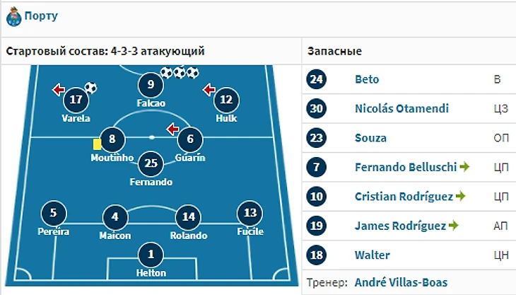 Основной схемой, по которой играл «Порту» Андре Виллаш-Боаша в Лиге Европы, была популярная 4-3-3 с атакующим уклоном, единожды но единожды использовался вариант с двумя центральными нападающими - классический ромб 4-4-2, где пару Фалькао составил бразилец Валтер. В целом же португальский наставник выпускал на поле не особо большое количество футболистов - основная обойма была относительно небольшой. На скрине ниже пример состава «Порту», в котором команда вышла на домашний матч четвертьфинала с московским «Спартаком».