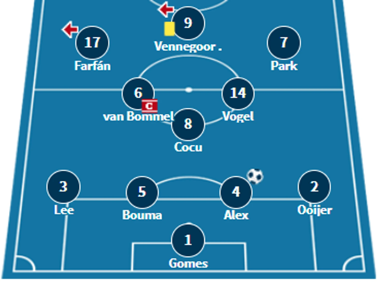 Качественный состав: Ван Боммел и Коку в опорной зоне, Фарфан и Пак Чжи Сун на флангах атаки