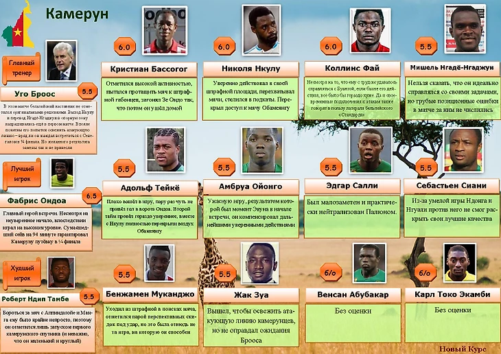 Камерун: Ондоа, Фай, Нкулу, Тейкё, Ойонго, Сиани, Нгадё-Нгаджуи, Бассогог (Токо Экамби, 83), Муканджо (к), Салли (Зуа, 76), Ндип Тамбе (Абубакар, 83).