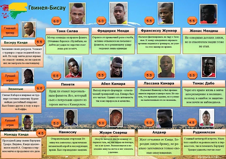 После финального свистка радостные буркинийцы достали майки травмированных партнеров и положили их в центр поля, намекая на вклад в успех всей команды. Симпатичной и не по-африкански тактически грамотной сборной Дуарте, прошедшей на турнире некоторую эволюцию за три тура, хочется пожелать дальнейших успехов. Своего соперника, а им может быть кто угодно из трио - Алжир, Тунис, Зимбабве - «жеребцы» узнают завтра. Парней же Басиру Канде хочется поздравить с их первым историческим достижением на КАН. Выстояв тяжелейший матч с хозяевами и едва не нокаутировав Камерун, Гвинея-Бисау точно не стала «грушей» для фаворитов. А Пикети и его голу стоит сказать отдельное «браво» и «спасибо».