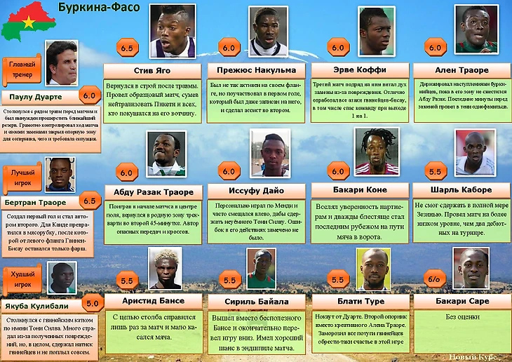 Все старания сборной с берегов Атлантики тормозились гиперуверенными действиями буркинийской защиты. Героем матча стал Стив Яго, сыгравший в лучших традициях Лиги 1, чей имидж всегда славили качественные фланговые защитники. Хотя, стоит признать, сдвиг в композиции игры произошел. Зезинью наконец-то смог продавить центр поля, а Тони Силва принялся за свое любимое дело – уничтожать репутацию оппонентов. Додержав счет до перерыва, буркинийцы продолжили дело во второй 45-минутке. Новым провалом обороны Гвинеи-Бисау воспользовался Бертран Траоре, с передачи Накульма установивший, как оказалось, финальный счет встречи. Дуарте не стал искушать судьбу и нагрузил свой состав еще двумя опорниками, отправив на скамейку классно сыгравших братьев Траоре. Последние 15 минут стали фарсом, в котором в бой шли эмоции, симуляции, но никак не игра в футбол.