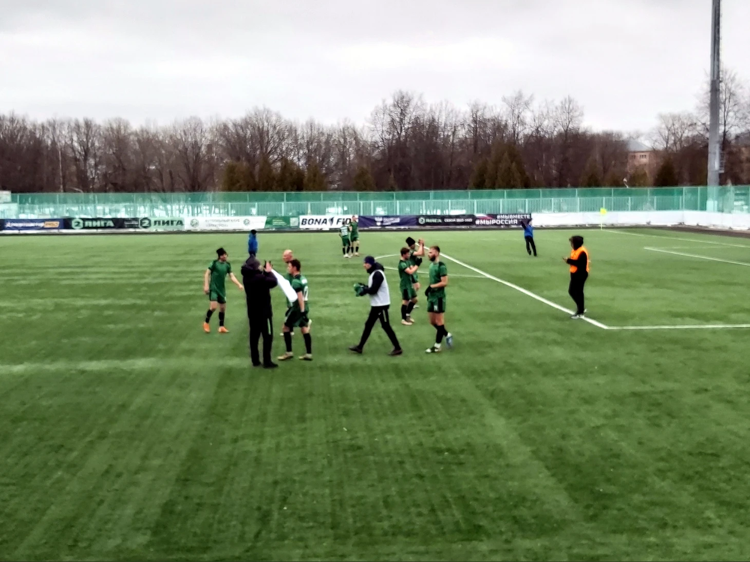 Довольные результатом игроки подходят к своим болельщикам и благодарят тех за поддержку. До Великого Новгорода доехали только двое, что в условиях рабочего понедельника и не блещущего результатами клуба, показатель весьма неплохой.
