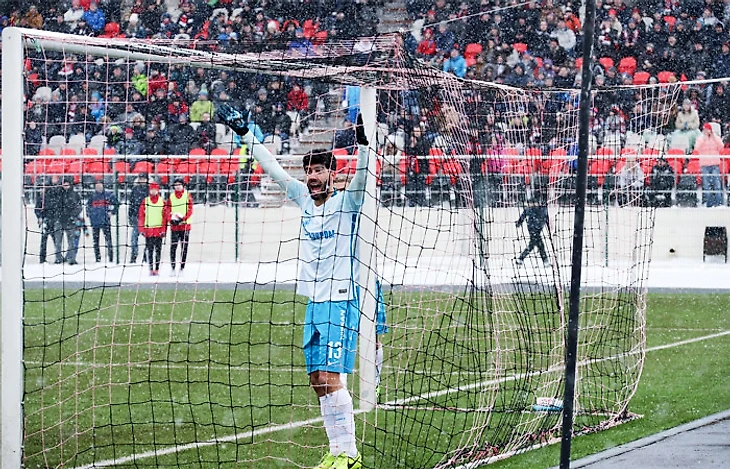 «Амкар» играл с «Зенитом» также 12 марта. На игру пришло 12 200 зрителей. Шел снег. Выглядело это так (для иллюстрации, конечно, показываем «спасение» Луиша Нету).
