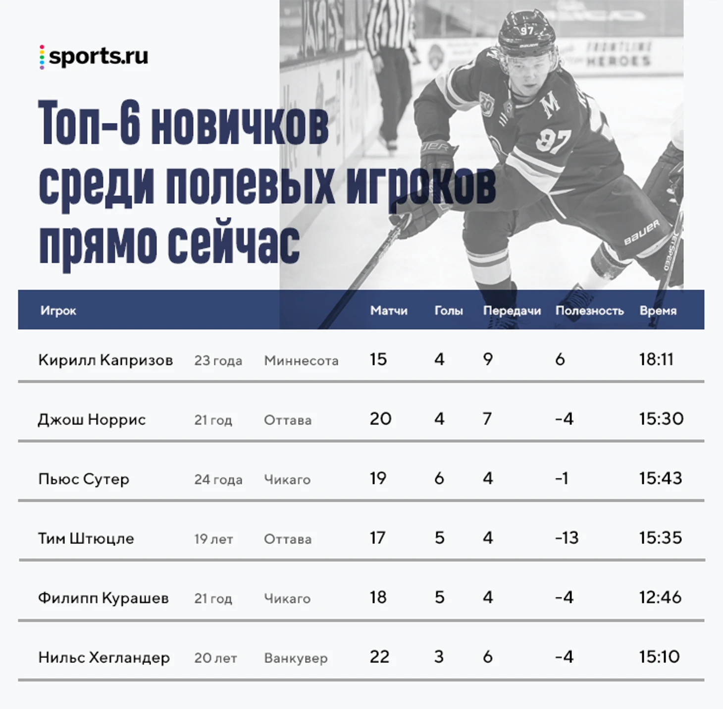 У Кирилла Капризова – 4+9 очков в 15 матчах, он лучший бомбардир «Миннесоты». У него первое время в среднем среди нападающих клуба – 18:11 и показатель полезности «+6». На данный момент он лидирует в гонке новичков сезона.