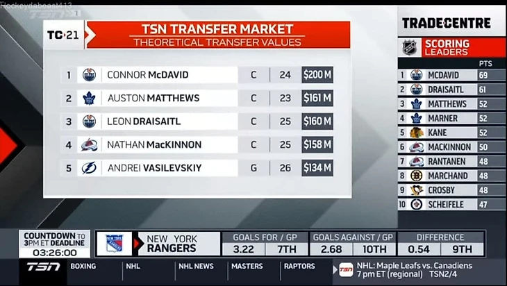 18:45 Ни одного трейда. Ведущим онлайна TSN настолько скучно, что они прикидывают «футбольную» цену суперзвезд НХЛ. Никита Кучеров, если что, по этой версии стоит 110 миллионов: