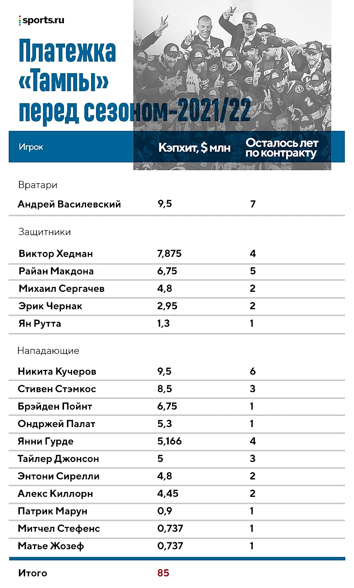 Не поверите, но там уже минус: прямо сейчас суммарный кэпхит игроков «Тампы» составляет 85 млн – «Молния» превышает потолок зарплат, который составляет 81,5 млн. В межсезонье его можно превышать не более чем на 10%, но к началу чемпионата клуб должен полностью укладываться в кепку.