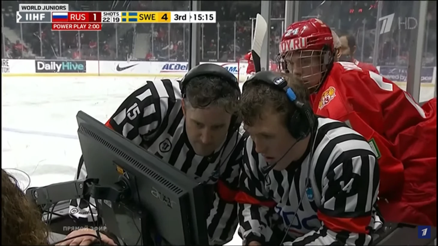 Судьи свистнули удаление у шведов, но потом пошли смотреть видео. С нашей скамейки подглядывал Данила Юров.
