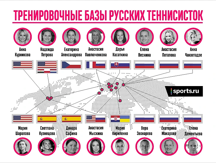 Самые успешные теннисистки последних лет тоже в основном тренируются за рубежом: последняя русская в топ-10 Дарья Касаткина – в Словакии и Испании, а нынешняя первая ракетка России Екатерина Александрова – в Чехии.