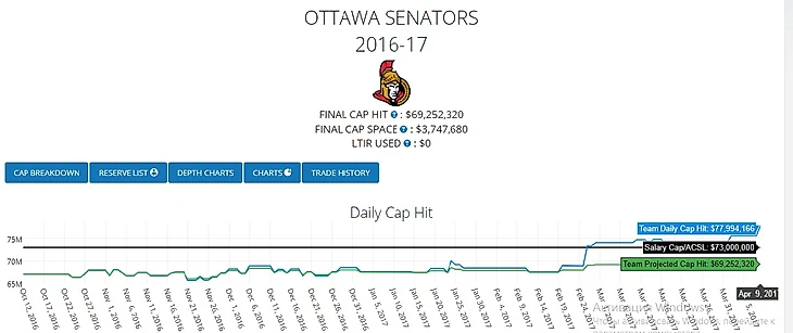 Ниже вполне наглядно (всё как и любят мифоносители) представлены цифры зарплатной ведомости Оттавы сезона 2016/2017. Обратим особое внимание даже на превышение потолка после дэдлайна – удивительное дело, оказывается жмоты способны вылазить за потолок зарплат!