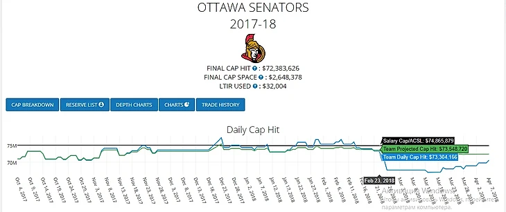 А здесь – годом позже (обратите внимание на превышение потолка до дедлайна). Собственно, ровно до тех пор, пока в феврале не было принято решение об уходе в перестройку – Оттава тратила весьма прилично, - на уровне если и не претендента, то что-то около того. А что делают клубы в перестроечные времена? Правильно, - скидывают тяжелые и большие контракты, часто отдают лидеров за пики… ну, в общем, все всё знают, кого чего что и куда и происходит.
