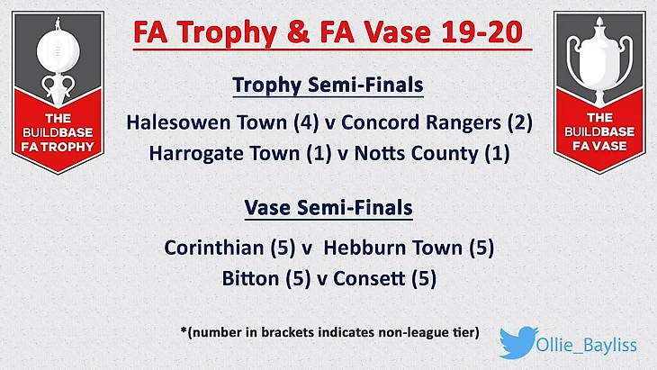Хорошая новость — кубки нон-лиги доиграют. Это FA Trophy (Д5-Д8) и FA Vase (Д9-Д11). Остались полуфинал и финал на «Уэмбли» (финал традиционно для двух турниров в один день).