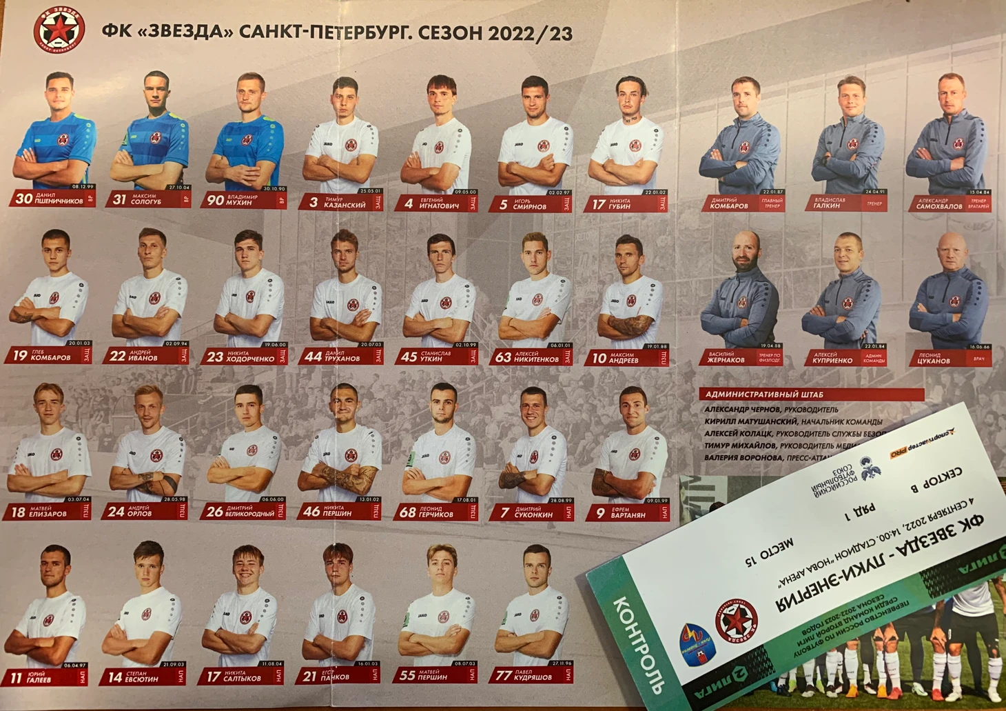 Для посещения домашней игры «Звезды» я выбрал матч с командой «Луки-Энергия». Многострадальный футбол Псковской области недавно вновь остался без профессионального клуба в облцентре, а значит великолукская команда осталась единственной профессиональной в регионе. Но речь сегодня всё же о «Звезде». Принимает соперников команда на севере города, на стадионе «Nova Arena», который делит с ФК «Ядро» (про них я кратко писал в отчёте о посещении местного «Динамо» – статья выходила только на моём канале в Telegram) и…санкт-петербургской академией туринского «Ювентуса». До недавнего времени там же играл и «Ленинградец», но по мере роста амбиций «областные» перебрались на главную арену «Петровского». По периметру арены чередуются баннеры «Ядра» и академии «Юве», без всяких упоминаний «Звезды», хотя она пока куда успешнее соседей – «ядерные» гордо замыкают таблицу дивизиона. Проход на матч бесплатный: у входа после традиционного досмотра приветливый молодой человек вручает билет, отпечатанный на приятной глянцевой бумаге, а затем пропускает внутрь. У него же можно попросить и программку матча для коллекции, тоже абсолютно бесплатно. Об этом я узнал чуть позже от соседей по трибуне и спустился за ней в перерыве. Программка маленькая, один сложенный цветной лист, что сильно отличает его от многостраничного буклета, например, «Ленинградца» с множеством интервью и обзоров матчей. Впрочем, программка достаточно симпатичная и информативная: состав команды, турнирная таблица и расписание игр – всё самое необходимое присутствует.