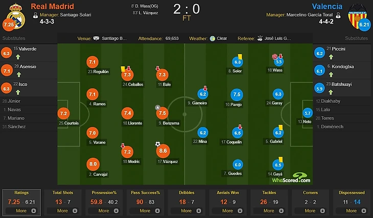 Whoscored.com немного удивил: с одной стороны завышенные оценки Бэйлу, Бензема и Асенсио, а с другой - явно недооценили вклад Куртуа и Карвахаля во вчерашнюю победу.
