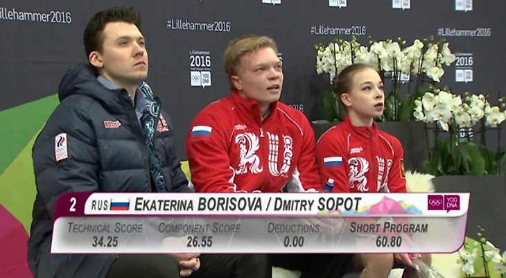 Павел Слюсаренко, Дмитрий Сопот, Екатерина Борисова после короткой программы на Юношеских олимпийских играх 2016