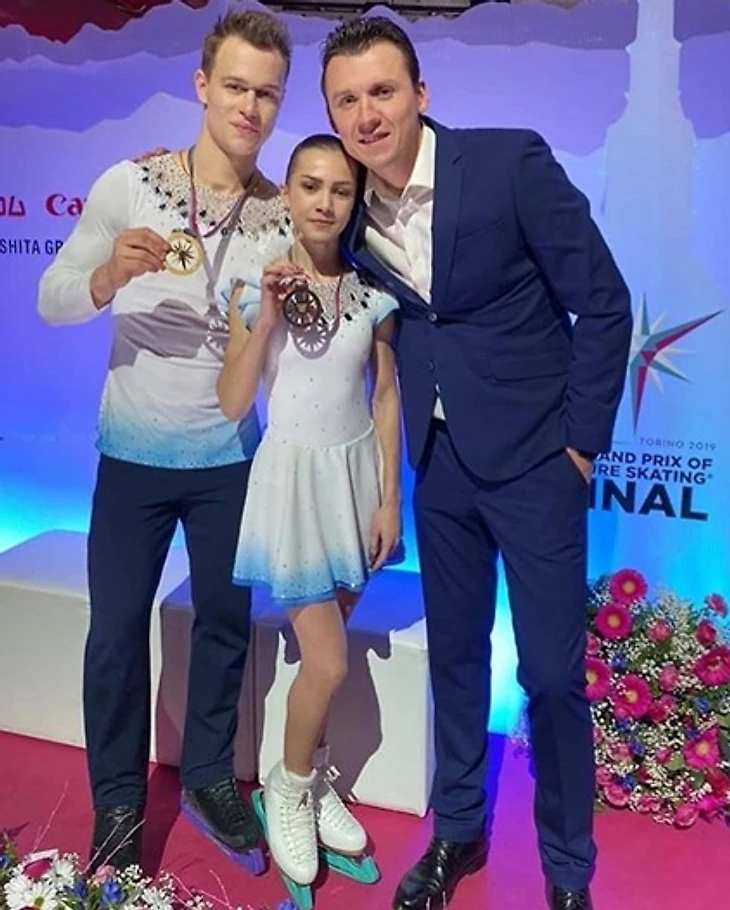 Дмитрий Рылов, Аполлинария Панфилова и Павел Слюсаренко на финале Гран-при 2019 среди юниоров