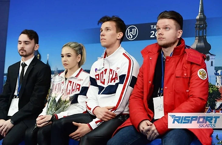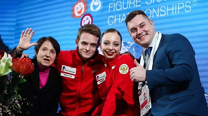 Василий Великов, Ксения Ахантьева, Валерий Колесов и Денис Лунин после произвольной программы на чемпионате мира среди юниоров