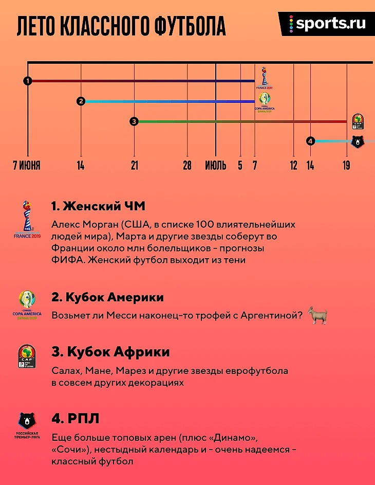 Этим летом нет ни ЧМ, ни Евро, но мы точно не останемся без футбола. Ловите календарь на ближайшие недели!